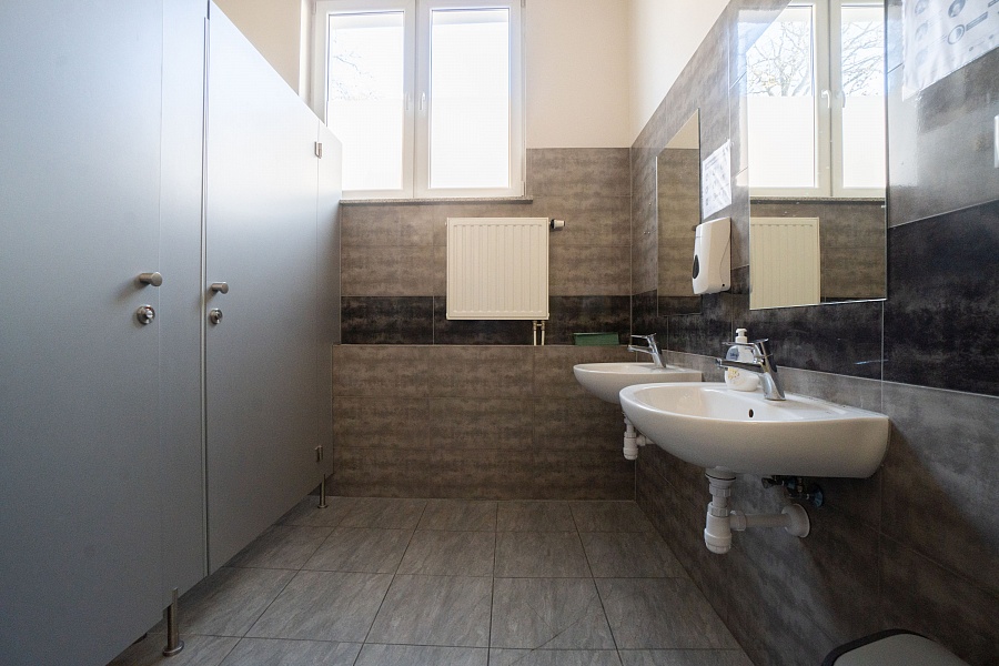 Z korytarza dostęp do toalet (damska, męska, dla niepełnosprawnych), obok lokalu jest również pomieszczenie socjalne (aneks kuchenny, szafa) do użytku wszystkich najemców.